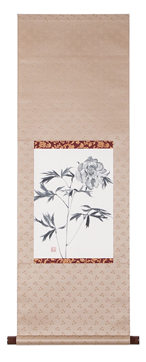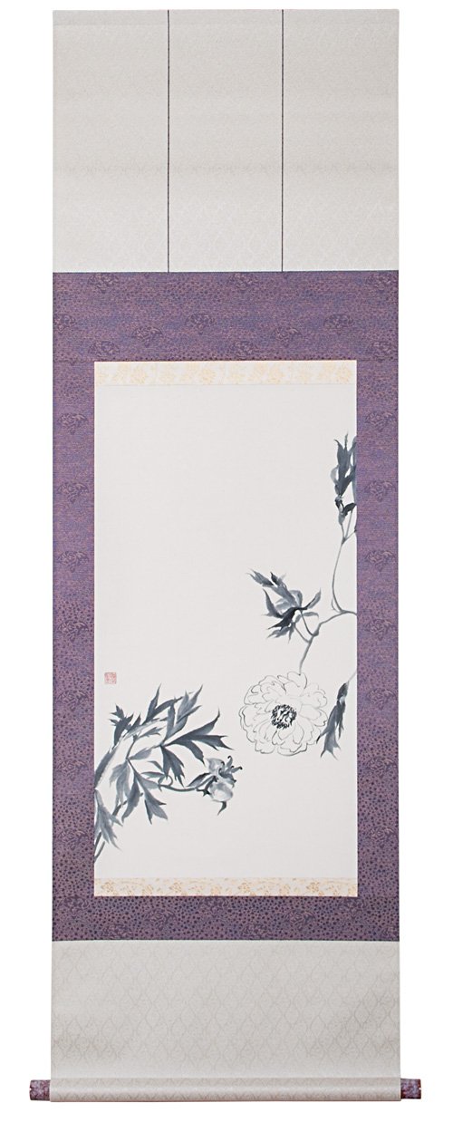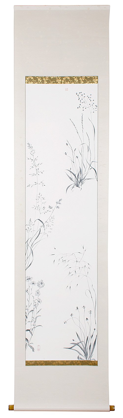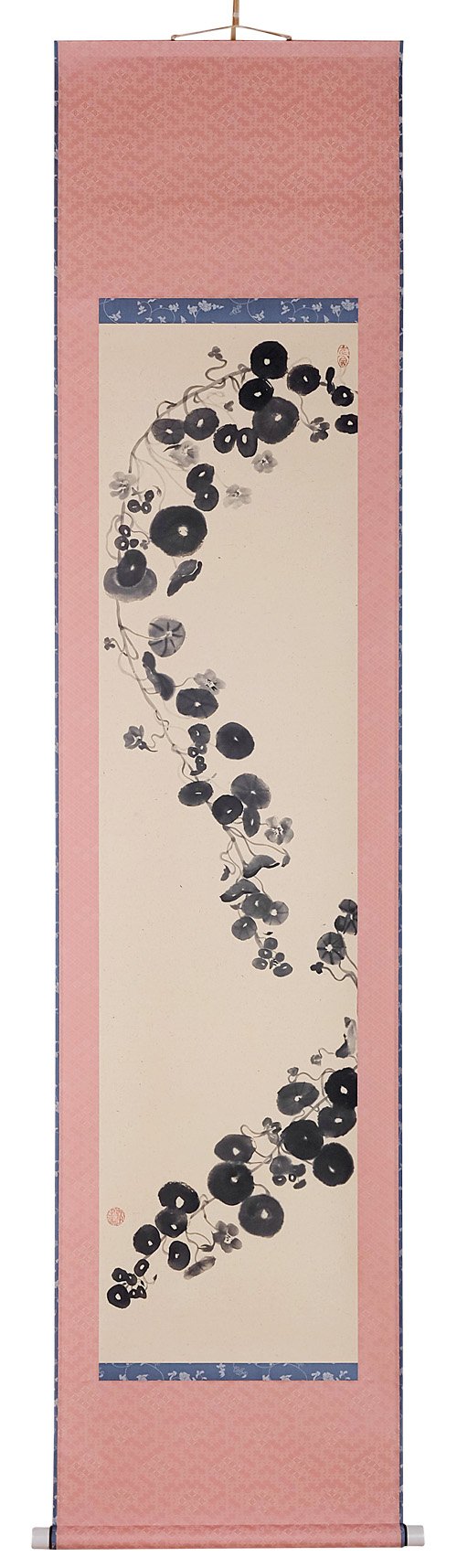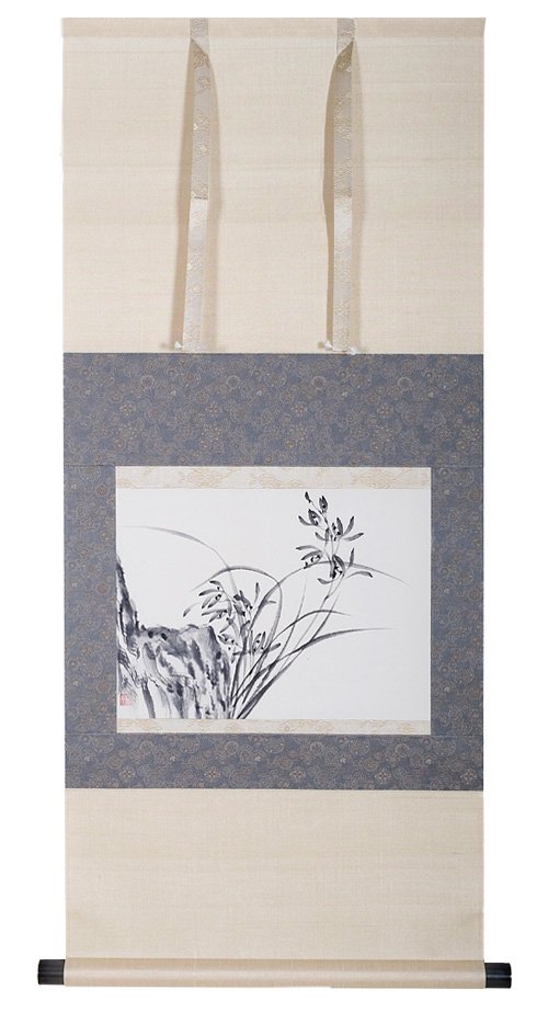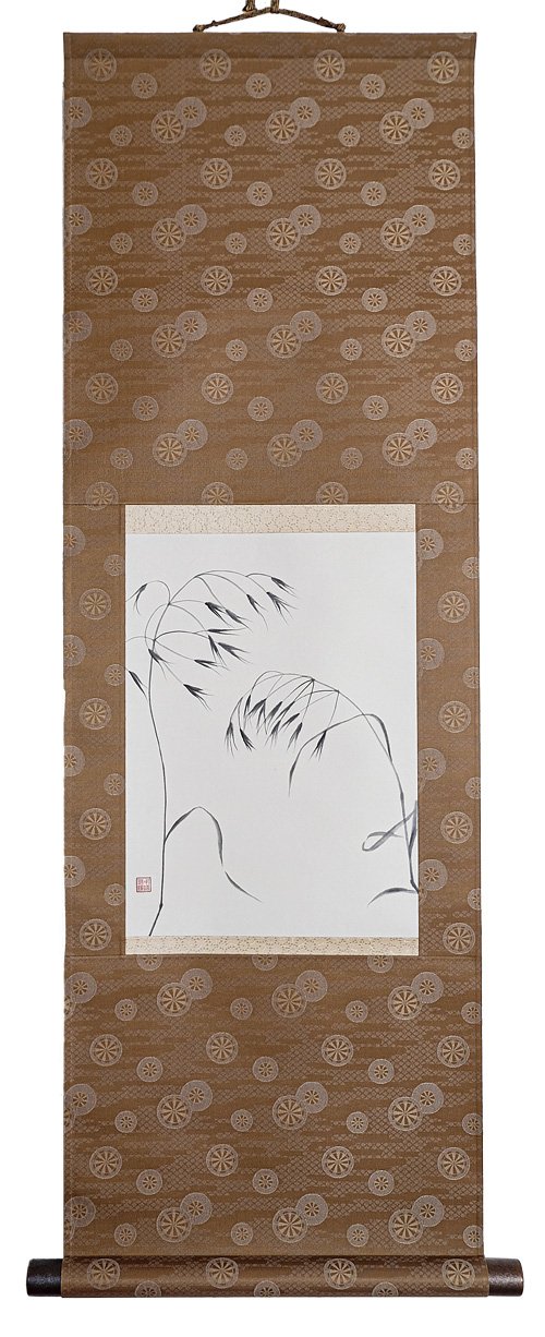 Seidenbrokatstreifen über und unter dem Bild, verschiedene Stoffe für Bildumrahmung und die Bereiche darüber «Himmel» und darunter «Erde» (Rohseide). Der Bereich «Himmel» ist von oben herabhängend durch sogenannte «Futai» Windstreifen. geschmückt.