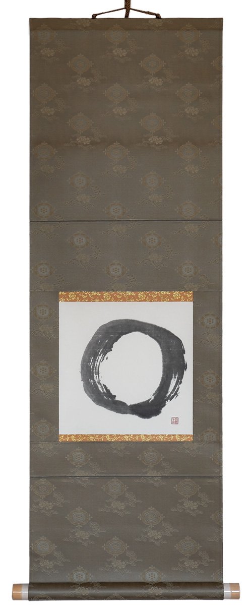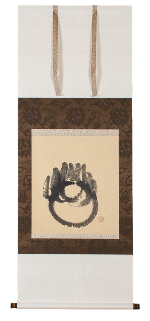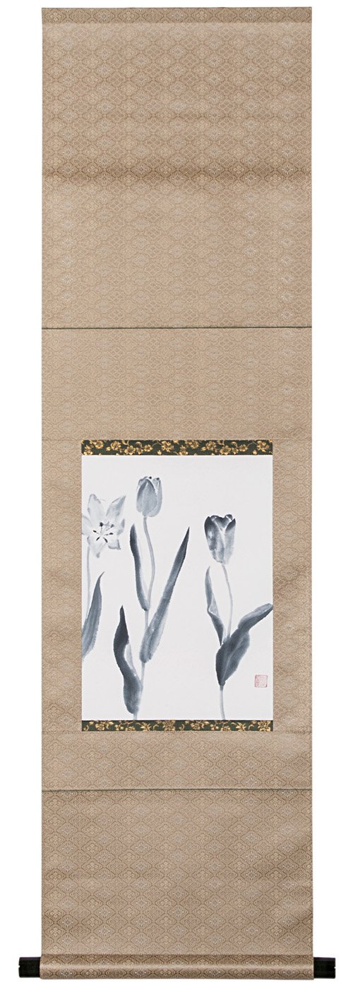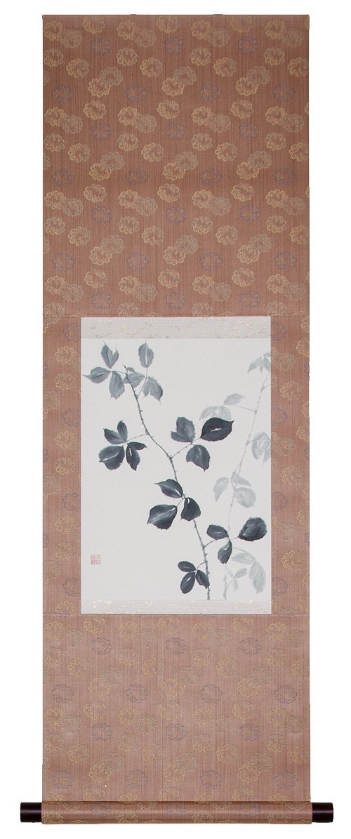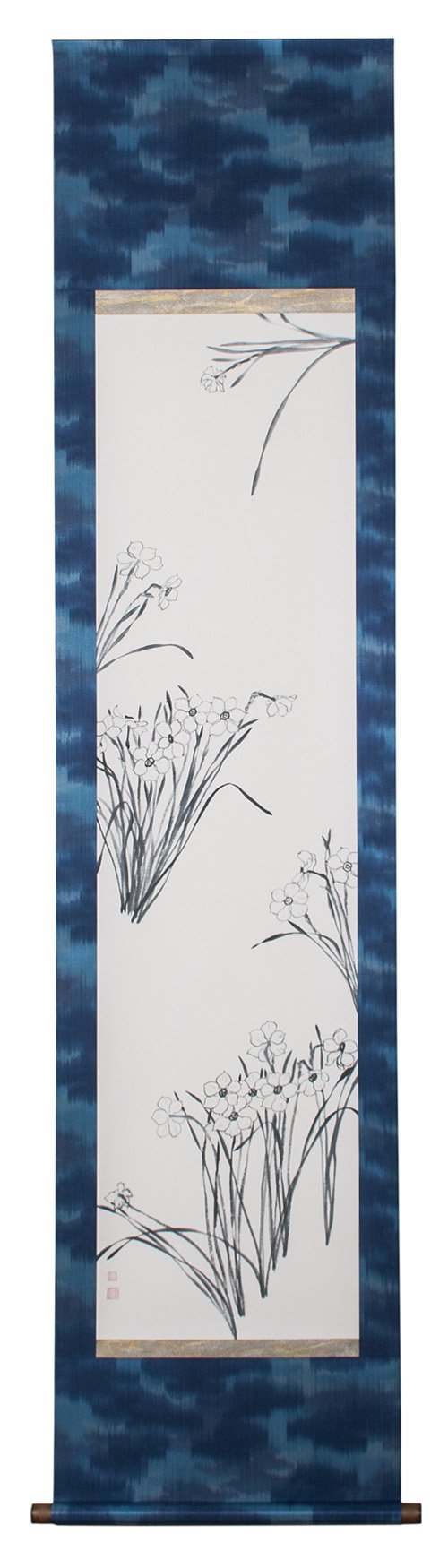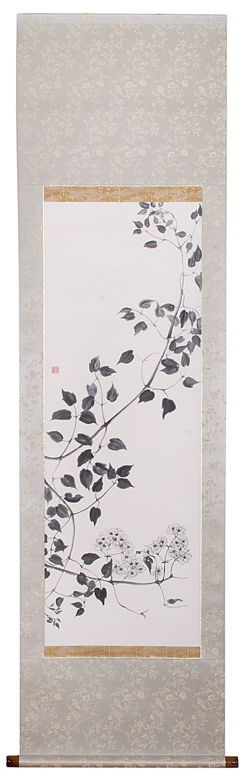 Seidenbrokatstreifen über und unter dem Bild, verschiedene Stoffe für Bildumrahmung und die Bereiche darüber «Himmel» und darunter «Erde» (Rohseide). Der Bereich «Himmel» ist von oben herabhängend durch sogenannte «Futai» Windstreifen. geschmückt.