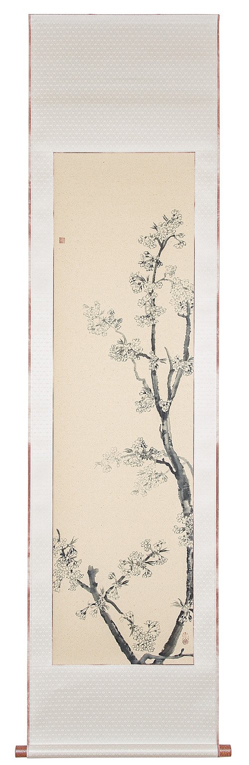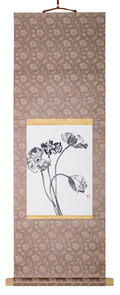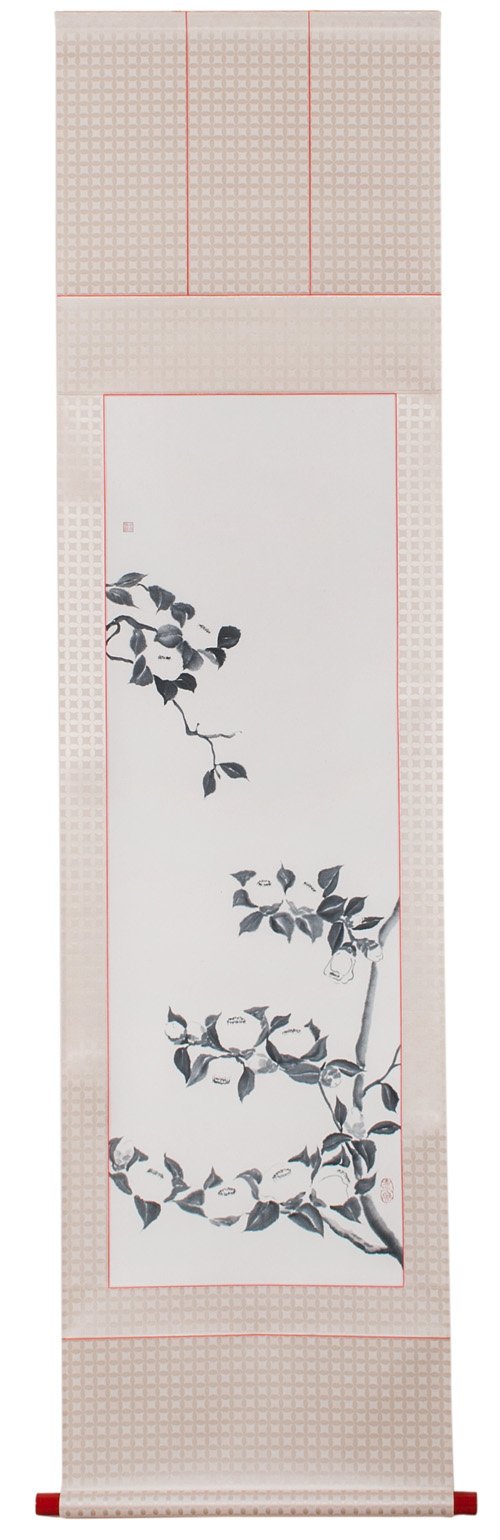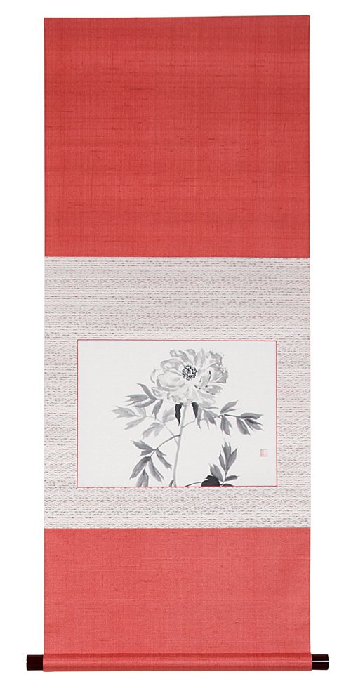 Spezielle Montierung der Bildrolle: Bildeinfassung und Bildunterteilung durch feine rote Stoffbänder, was einer traditionellen Aufteilung von Hängerollen entspricht.
