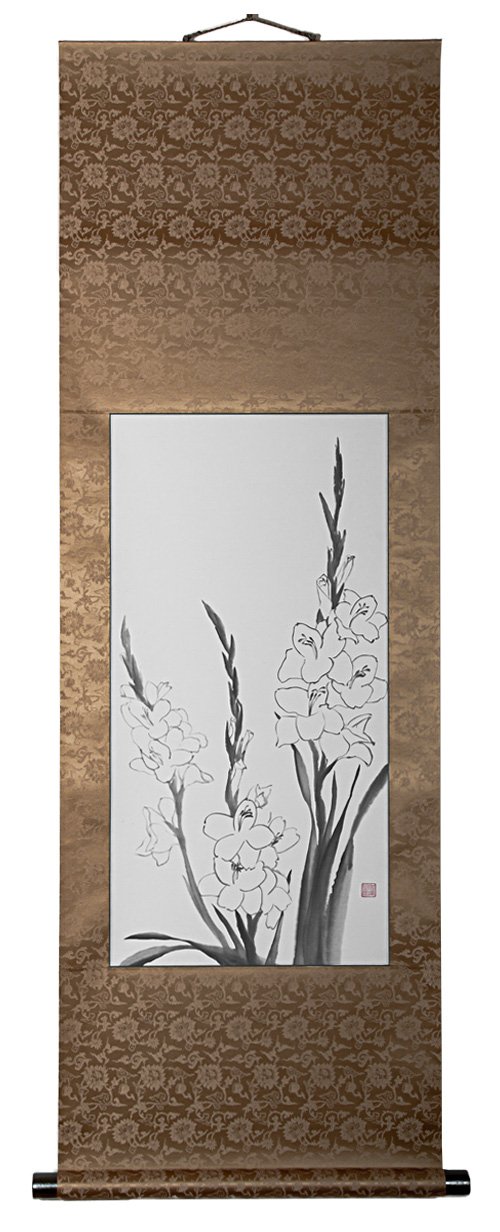 Das Bild ist mit feinen Seidenbrokatbändern umrahmt, auf Rohseide montiert, und diese ist seitlich mit dem gleichem Band eingefasst.