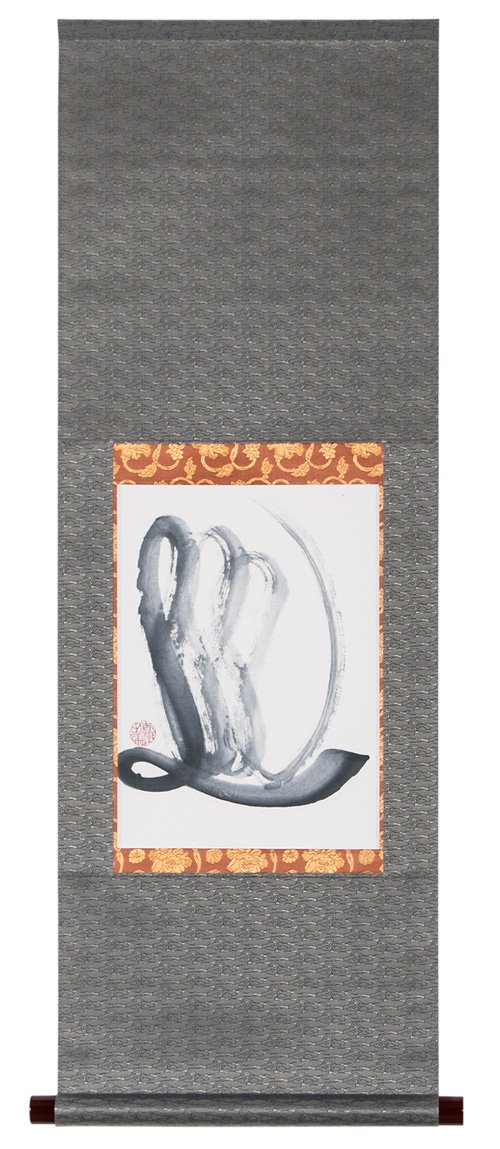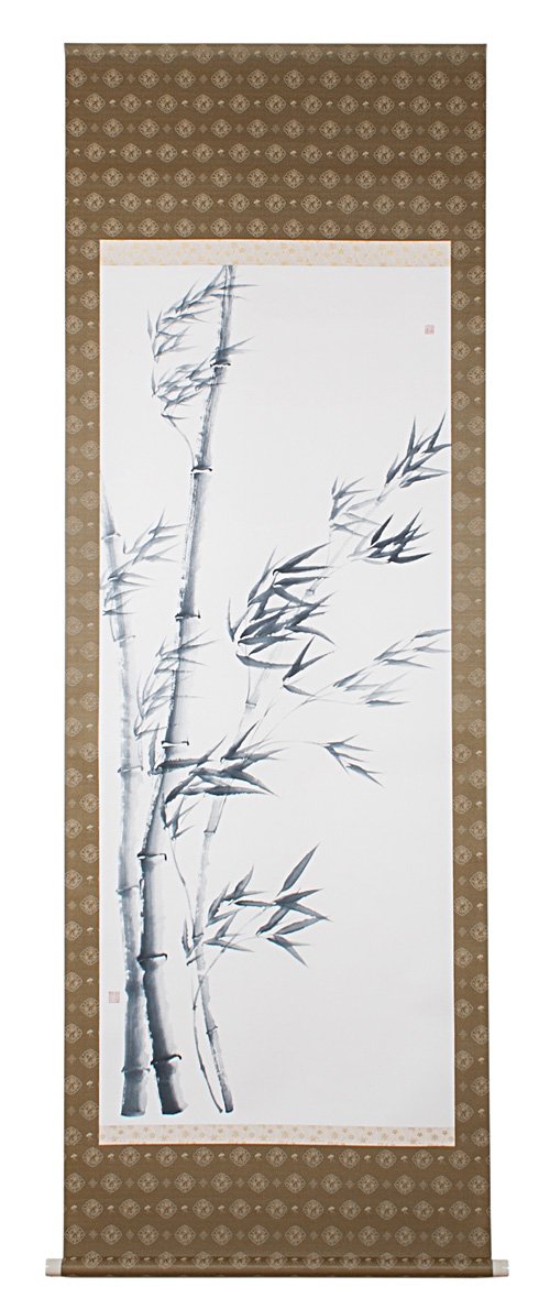 Seidenbrokatstreifen über und unter dem Bild, verschiedene Stoffe für Bildumrahmung und die Bereiche darüber «Himmel» und darunter «Erde» (Rohseide). Der Bereich «Himmel» ist von oben herabhängend durch sogenannte «Futai» Windstreifen geschmückt.